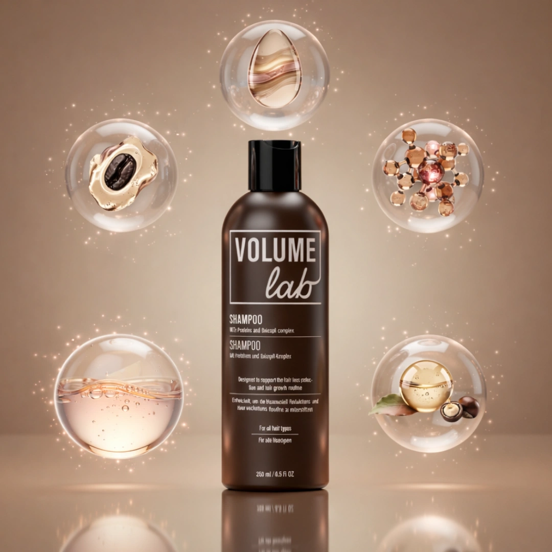 Volume Lab losjonas (150 ml): Aqua, Caffeine, Propanediol, Benzyl Alcohol, Sodium Benzoate, Hydrolyzed Wheat Protein, D-panthenol, Lactic Acid, Arginine, Hydrolyzed Soy Protein, Potassium Sorbate, Tocopherol Acetate, Ascorbic Acid, Glycerin, Glycine Soja Germ Extract, Triticum Vulgare Germ Extract, Gluconolactone, Scutellaria Baicalensis Root Extract, Biotin, Calcium Gluconate